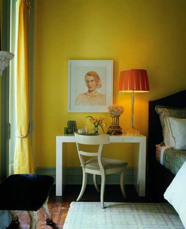 Примерно в таком же количестве используют жёлтый цвет. Лучше всего его применять в небольших комнатах, и не перебарщивать с насыщением, поскольку яркий золотистый декор может не слишком благоприятно подействовать на качество сна.