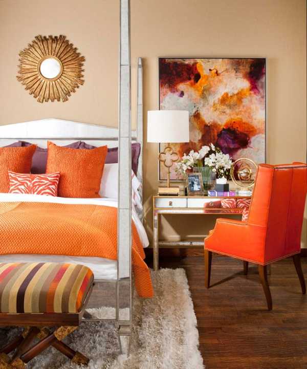 Рекомендация за гранью устоявшихся норм — игра с фиолетовым цветом. Ведь по сути он нейтрален, как смесь холодного синего и горячего красного. Если вы любите этот цвет, попробуйте добавить в интерьер спальни сиреневый текстиль или отделать одну из стен. Придумайте себе правило для поддержания порядка. Ничто не вгоняет в уныние так, как стул с наваленной горой одежды, даже чистой и только что снятой с сушилки.Оранжевый