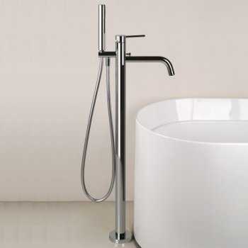 Смесители напольного монтажа пока выглядит экзотично. Особенность такой конструкции — установка смесителя на стойке, закреплённой на полу. Этот вариант идеален для огромных санузлов, где ванна размещается не возле стены, а посередине комнаты. Чаще всего для напольного крепления выбирают однорыжчаные смесители, с которыми можно управиться без труда даже одной рукой.