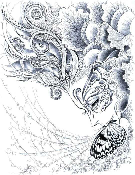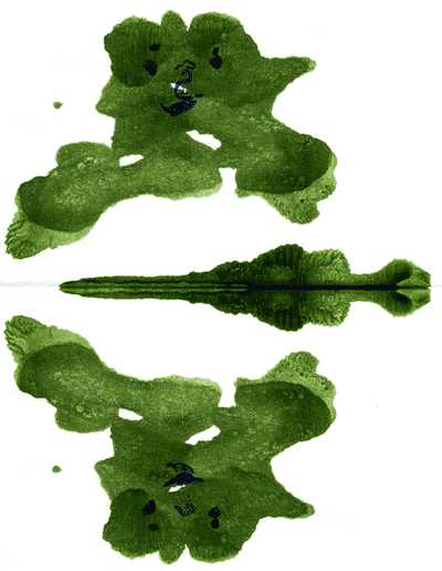VI. Кляксы: капнуть и дать растечься краске по листу. В центр кляксы можно подуть через трубочку. Изображения из кляксы можно сделать зеркальными, если сначала сложить лист пополам (или скрутить его), затем расправить и капнуть на него краской. Теперь снова складываем лист и слегка прижимаем. Дальше — дело вашего воображения. Смотрите, на что похожи кляксы, и дорисовывайте необходимые детали. Ниже — зеркальный рисунок из кляксы Юлии Митко.