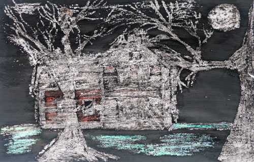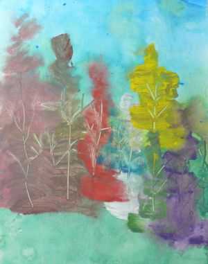 6. проявляющийся «второй» слой возможен при многослойном изображении. Нарисуйте мелками или свечой что-нибудь на листе бумаги и покройте акварельными красками. На те места, где нарисовано что-то мелком или свечой, краска не будет ложиться ровно, и из-под нее будет проглядывать изображение;