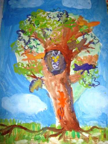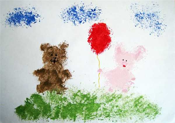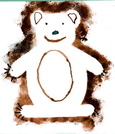 10. придать «пушистость» изображению можно при помощи марли или целлофана. Хорошо получается использовать этот эффект с трафаретом. Вырежьте из картона фигуру животного и приложите к листу бумаги. Теперь опускаем марлю или целлофан в краску, разведённую водой, и легкими движениями проходим по контуру трафарета. Когда трафарет уберёте, увидите чёткую фигуру животного, а его контур будет выглядеть мягким и пушистым (например, как медведь, нарисованный при помощи марли Корявиковой Валерией).