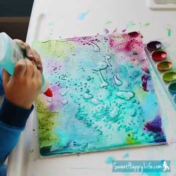 2. Капельки клея. На рисунок с невысохшей акварелью посыпьте соль, что даст интересные разводы, а затем покапайте канцелярским клеем.