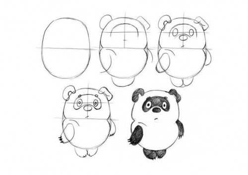 Дети постарше хотят уже изображать смешных мультяшных героев, и в этом нет никакой сложности. При помощи всё тех же геометрических фигур (овала и круга) рисуется тело зверька, а остальные детали – пушистый хвостик и мордочка делается в виде штриховки. Остается только раскрасить рисунок любым удобным способом.