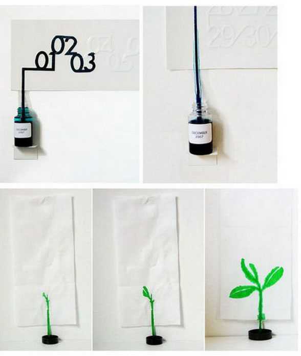 Испанский дизайнер Оскар Диаз придумал и спроектировал календарь, который использует капиллярное действие чернил. Жидкость постепенно распространяется по бумаге и за счет этого проявляется дата.