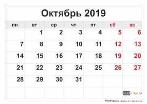 Скачать и распечатать календарь на 2019 год по месяцам. Каждый месяц календаря с большими цифрами для распечатки на отдельной странице А4. Также в шаблоне календаря на месяц есть место для небольших заметок и записей.
