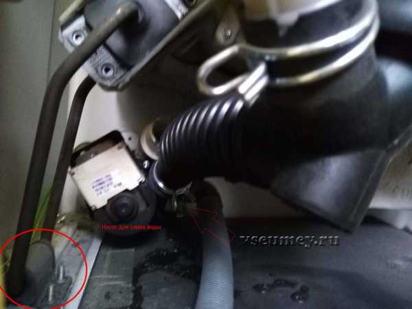 Далее надо отсоединить сливной шланг бака от насоса, сжав своеобразных хомут.