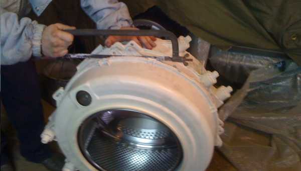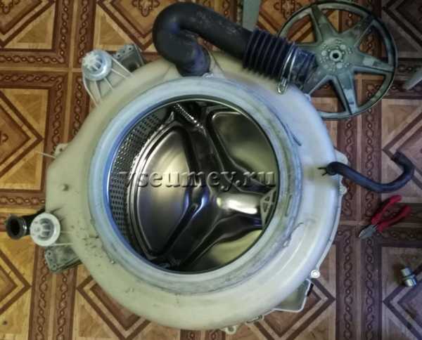 Далее надо каким то образом выбить барабан из бака. Можно при помощи помощника и киянки с молотком, чтобы не повредить. Или найти покрышку по размеру, чтобы барабан проходил внутрь, а пластиковый бак упирался в её края.