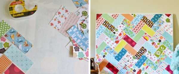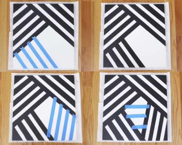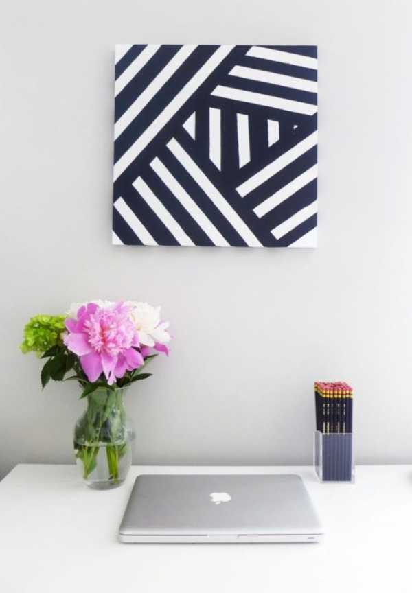 - Для создания яркого украшения интерьера на листе картона выкладываем изолентой геометрические фигуры (ромбы, треугольники, квадраты). Можно наложить одну фигуру на другую. Получившиеся элементы узора заполняем красочным слоем.