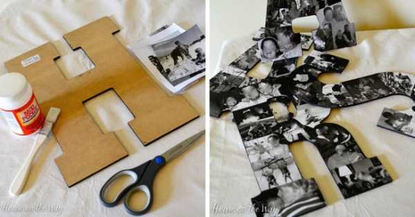 - Продлить жизнь старым фотографиям можно следующим способом: вырезаем из картона буквы нужного размера, оклеиваем их фотографиями и создаем веселую надпись. Подобный декор оживит и украсит интерьер.