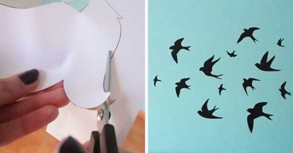 - Находим в интернете шаблоны птиц. Это могут быть бабочки, голуби, снегири. Распечатываем и вырезаем. Бумажные фигурки птиц клеим на плотную основу, вырезанную из картона, или украшаем летящими птицами стену.