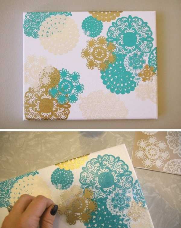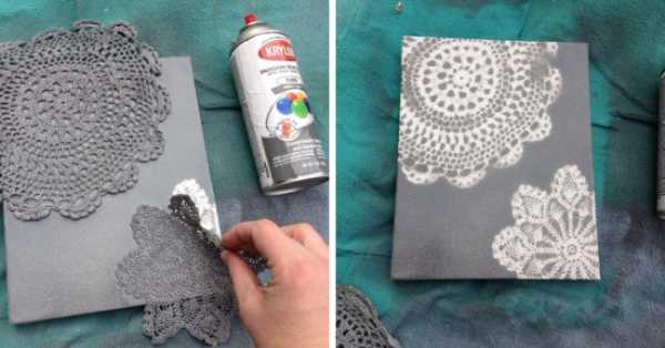 - Кружевная салфетка легко заменяется вырезанной из бумаги снежинкой. Нужно только расположить салфетку на холсте и забрызгать фон пульверизатором.