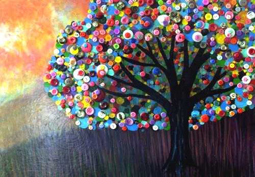 - Пуговицы легко превратятся в пышную листву дерева, если нарисовать на листе бумаги ствол, многочисленные ветки и закрепить любым доступным способом на ветках пуговичные «листья».