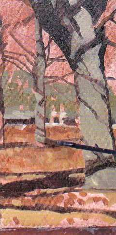 Перейдем к деревьям, изображенным на переднем плане. К цвету, которым рисовали дальние деревья, добавьте как можно больше белил и совсем немного желтой охры. Затем нанесите получившийся тон на стволы деревьев на центральном плане картины. Добавив еще немного белил, напишите более светлые участки стволов деревьев, верхние ветви голых исполинов и не оставьте без внимания лесную почву.