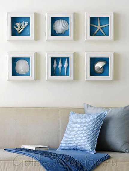 Дальнейшая задача ясна без слов. Как вы уже успели догадаться — вырезаем квадраты из картона по размерам рамки. Затем наклеиваем на них раковины и вставляем внутрь. Вуаля – морская картина своими руками рождена! Если оттенки синего в этой комнате ни к чему не подходят, то вы можете заменить их на любой другой цвет.