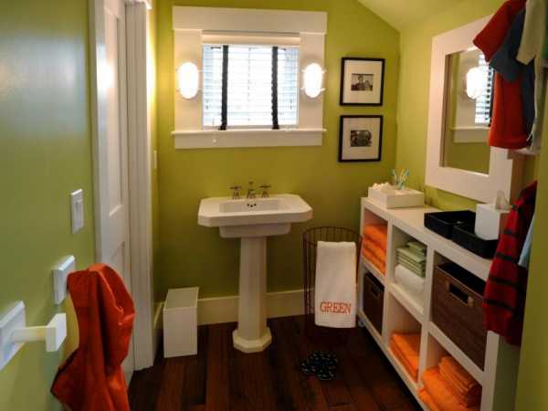 Поскольку родители с детства хотели бы приучать ребенка к порядку, корзинка для белья должна быть невысокой, чтобы он свободно мог положить в нее вещи. К полочкам в шкафу, на которых лежат полотенца и банные принадлежности, тоже должен быть удобный доступ.