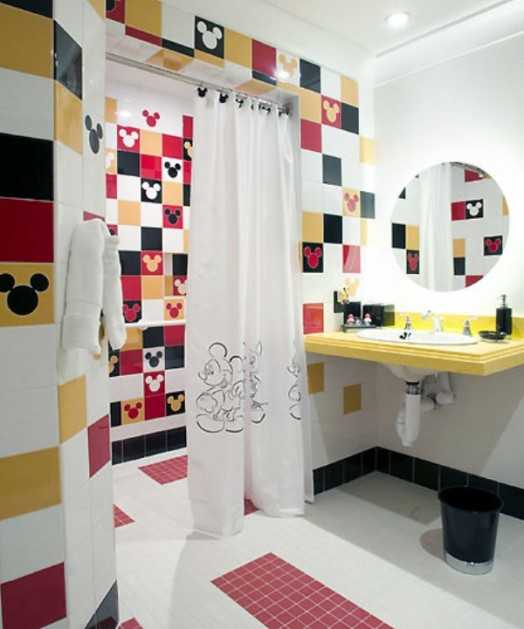 Кроме героев мультфильмов, ванной можно придать такие цвета, как красный или желтый, немного разбавив их при необходимости оливковым или голубым оттенками. Такие сочетания никак не испортят комнату, напротив, ванная для детей получится той, что надо.