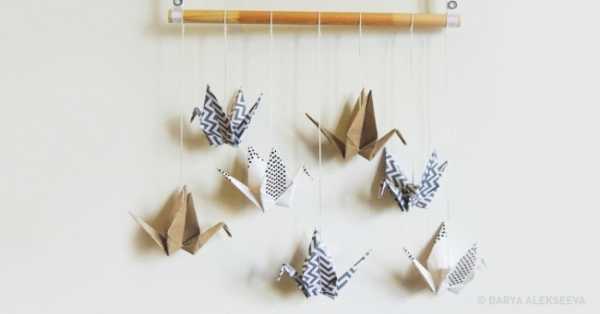 Вместе с детьми можно научиться делать оригами, которые украсят любую самую обычную стену. Такие небольшие бумажные инсталляции и менять легко, и украшать ими можно как стену над любимым диваном, так и комнату подростка. Крепить журавликов можно при помощи двухстороннего скотча, клея, лент и веревок.