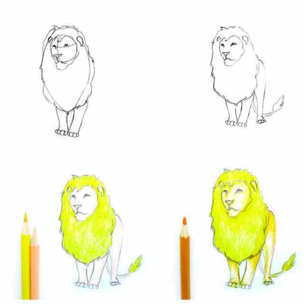 Желтым карандашом теплого песочного оттенка создаем тень и полутень на участках туловища и мордочки нашего льва. Также можно пройтись и по контуру гривы для придания объема.