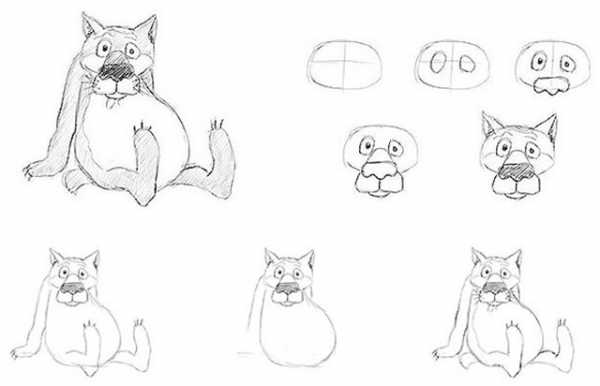 - Более детально обозначим передние и задние лапки, нарисуем длинные ушки. Удлиним овал головы, разделим на 4 зоны.