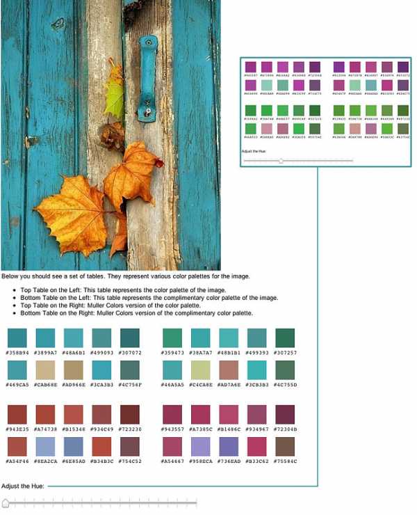 предлагает: color palette of the image, complimentary color palette of the image, Adjust the Hue: