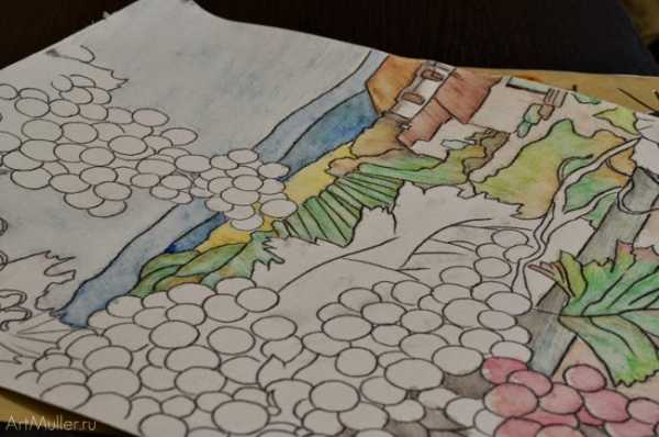 1. Рисуем расположение объектов на картине. Сначала крупные объекты: дом, стена балкона, виноград. Затем добавляем детали.