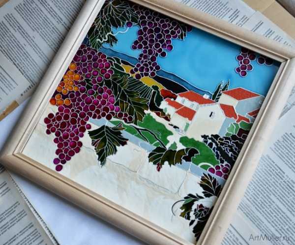 На фото уже готовая картина, осталось только покрасить раму. Остальные фото и описание готовой картины на стекле «Виноградник» смотрите в Каталоге.