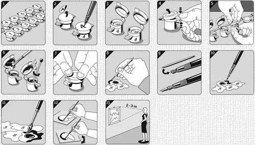 Секрет творчества кроется в том, что площадь холста содержит пронумерованные участки, на раскраску каждого из которых имеется баночка краски с соответствующим номером. Живопись по номерам с акриловыми красками производится в следующей последовательности: