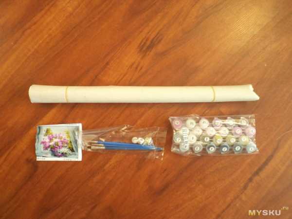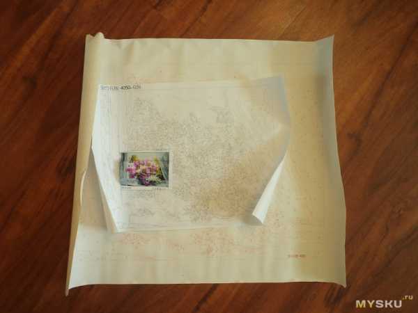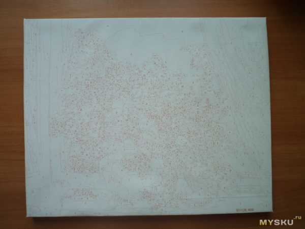 Холст имеет размеры, точно соответствующие завяленному размеру готовой картины (в данном случае, это 40 х 50 см), и припуски для крепления холста к подрамнику. Сам подрамник в комплект поставки не входит, но его можно очень легко сделать самому из реек сечением 20 х 20. Впрочем, если вы и по столярной части дилетант, то можно поискать в Китае наборы, в которые входит сборно-разборный подрамник.