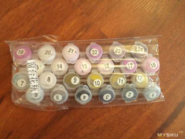 Во-вторых, это набор акриловых красок. Краски расфасованы в небольшие баночки, промаркированные номерами. Номера красок соответствуют номерам закрашиваемых областей на холсте. В данном комплекте используется 24 цвета. Краски готовы к использованию. Можно не волноваться: объема красок каждого цвета гарантированно хватит для всей картины.