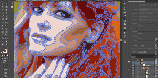 Когда с цветами все в порядке, можно добавить детализации, отрисовать глаза, губы. Для этого нам пригодится тот самый припасенный на новом слое оригинал фотографии. Включите видимость (слой с контурами можно наоборот — выключить), возьмите инструмент карандаш. Рисуйте контуры вокруг областей, берите пипетку и заливайте новые контуры цветами с фотографии или цветами других контуров. Обведите белки глаз, зрачки. Рисуя радужку, лучше использовать 2-3 цвета — для темных и светлых областей, а так же для бликов. Губы — так же — 2-3 цвета для освещенных и затемненных участков, для блика. Выбирая линию смыкания губ, избегайте коричневых и серых цветов, даже если такой цвет в палитре документа уже есть. Возьмите темно-красный, бордовый, в крайнем случае — коричнево-красный цвет, это придаст губам жизни. Отрисуйте некоторые пряди волос, ногти, детали одежды, на которых хотите сделать акцент, ноздри и крылья носа.