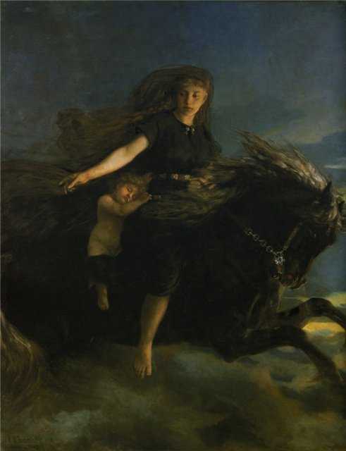 Богиня ночи Нотт (Nott) – из великого рода йотунов. Эдда описывает ее как «от рождения черную и сумрачную».Её дед был первым вождем всех йотунов, а отец – лучшим архитектором всех Девяти Миров, именно по его чертежам был построен Асгард, Трюмхейм и залы Утгарда.Сама Нотт была замужем трижды, и каждый муж оставил ей по ребенку. От первого брака с йотуном Нагльфари родился сын Ауд. Второй муж, водный великан Аннар, подарил Нотт дочь Йорд, которая станет матерью Тора. Последним мужем был рыжий ас Деллинг (Dellingr, рассвет), от которого у Нотт родился Дагр (Dagr), бог дня.Нотт считается одна из первых йотунов, которая родилась ещё до Великого Потопа. В былые времена она жила с богом ванов Фроди, от которого родила Ньорда, великого бога всех мореходов.Хотя у Нотт было много детей, она была никудышной матерью и редко занималась их воспитанием, оставляя все заботы отцам. Но Нотт отнюдь не глупа, она очень мудра, хотя и не любит делиться своими знаниями, и лишь в редких случаях она может поведать тайны прошлого. Единственная слабость богини ночи, это молодые красивые мужчины.По велению Одина Нотт и ее сын Дагр раз в сутки объезжают по небу всю землю на своих конях.Скинфакси (Skinfaxi, сияющая грива) везет по небу бога дня Дарга, и его грива освещает небо и землю. Днем он силён, а с наступлением ночи слабеет. Зато ночью возрастают силы Хримфакси (Hrimfaxi, покрытая инеем грива) – коня богини ночи Нотт, и к утру пена с его удил превращается в росу.
