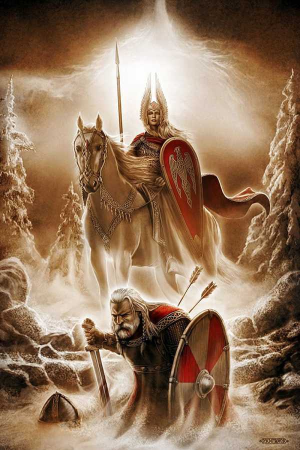 Валькирия (др.-исл. Valkyrja – выбирающая убитых) – в скандинавской мифологии дочь славного воина или конунга, которая реет на крылатом коне над полем битвы и подбирает павших воинов.Валькирий, по различным источникам, насчитывается либо девять, либо тринадцать. Они вооружены копьями и увенчаны шлемами. Их задача – сопровождать погибших героев в Вальхаллу. Иногда им даруется право решать исход битвы, а иногда они лишь выполняют веления Одина. В мифах валькирии предстают дочерьми Одина.Непосредственно с битвой ассоциируются имена валькирий Гунн (битва), Скёгуль(свирепствующая), Рандгрид (разбивающая щиты), Регинлейв (всадница бури) или Хильд (воительница).Иногда они выполняли и другие функции. Одна из валькирий носит имя Мист (туман), и её задача действительно состояла в том, чтобы при необходимости окутывать поле битвы туманом. Валькирию Херфьетур (оковы войны) можно было призывать на помощь, чтобы пленить врага.
