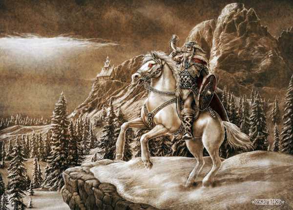 Зимняя Йольская Ночь, королева среди ночей……Тьма сгущается. Все плотнее Сумерки кутают своим занавесом Мать-Землю. Ночь поедает День, звенящая Тишина лежит в полях и седой Ветер гонит серебро небес по пустынным улицам.21 декабря с Запада громыхнет рог, и над спящими городами понесется в бешеной скачке Дикая Охота, возглавляемая Одином.Истошно лают в ночных небесах свирепые псы одноглазого Одина, мчит, обгоняя снежную бурю, его восьминогий конь Слейпнир, и следует за ним толпа безумных призрачных всадников, что зовется у смертных Дикой Охотой.Не отстает от Одина в бешеной скачке грозная жена его, богиня Фригг, которой ведомы судьбы всех людей и богов.Размахивает молотом Тор, погоняя черных козлов, запряженных в его колесницу.В слепой ярости несутся через хмурое зимнее небо сумрачные охотники, загоняя гончими псами свою диковинную добычу: призрачного ли кабана, белогрудую ли деву, или же древесную фею – Деву Мхов, точно пронизывающий зимний ветер гонит, сорвав с ветвей, остатки омертвелой осенней листвы. Горе тому, кто встретит Дикую Охоту на своем пути, ибо он последует за ней и более никогда не найдет пути обратно в мир живых. А ночи длинны в середине зимы, и только тепло очага защитит жителя земли от свирепых небесных ловчих.