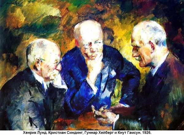 и яркий, «постимпрессионистский», написанный уже в 20-е годы портрет трех известных людей Норвегии, среди которых и Кнут Гамсун.