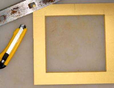 Отрезать кусок картона, по размерам равный нашей работе. Разметить его, определяя центр вышивки и паспарту, вычертить на картоне прямоугольник нужного размера. Отмерить по 2 мм от каждой линии и начертить еще два прямоугольника — больше и меньше размера первого прямоугольника, равного размеру вышивки.