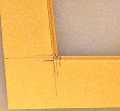 Теперь прорезать ножом для бумаги линию по железной линейке по внутренней разметке, а затупленной стороной ножниц или чем-то не слишком острым продавить линию по внешней разметке. В каждом углу надо сделать маленькие надрезики от одного угла до другого и загнуть внутрь поля, которые получились.