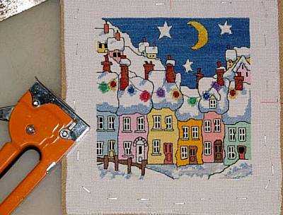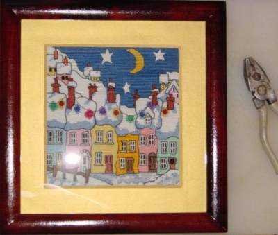 Обычно рамка состоит из трех частей: стекло, сама рамка и задняя часть, которая фиксирует картину. Вот к задней части картины и нужно прикрепить вышивку двусторонним скотчем или степлером.