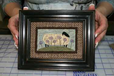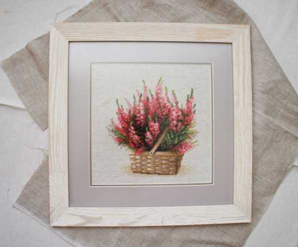 Собрать вышивку с готовым паспарту: сначала рамка, потом стекло, следом паспарту, затем вышивка, прикрепленная к задней стенке.