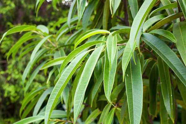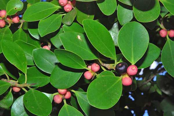 Имеет листья овальной формы, с острыми концами, блестящие, длиной 20-30 см, шириной 10-20 см. Розово – коричневого цвета молодые листья и зелёные старые. Может в большом возрасте плодоносит. Плоды маленькие, овальные, жёлтые или зелёные, диаметром 1 см. Но дома он вряд ли будет цвести.