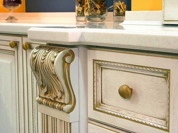 Изысканный вариант декора для новой или устаревшей мебели – патина. Можно приобрести готовые искусственно состаренные фасады или же сделать их самостоятельно. Деревянные предметы обрабатывают акриловой краской и шлифуют, гарнитур из ДСП покрывают эмалью или специальной пленкой. Поверх наносят лак. Особенно нарядно и эффектно смотрится сочетание золотой патины с белоснежной мебелью. Такой декор скрывает мелкие дефекты и полностью соответствует духу классики.