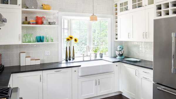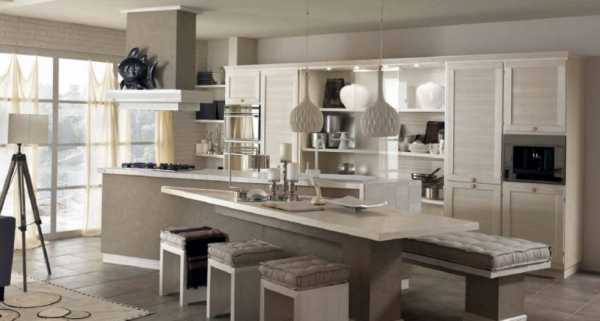 Безусловно, самым традиционным цветом, используемым не только для отделки поверхностей, но и производства мебели для классических кухонь, является белый и все его оттенки. Светлая палитра способна не только зрительно расширить пространство, придать ему умиротворенный и комфортный вид, наполненный свежестью, но и стать прекрасным фоном для ярких элементов. Такими контрастными штрихами может вступать посуда, текстиль, кухонные аксессуары или элементы освещения.