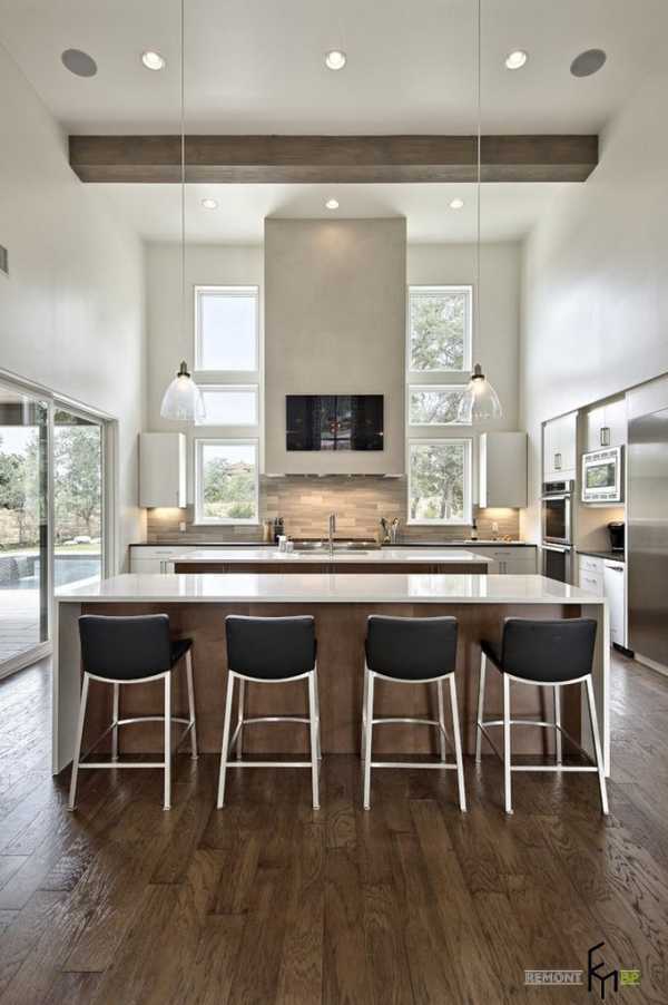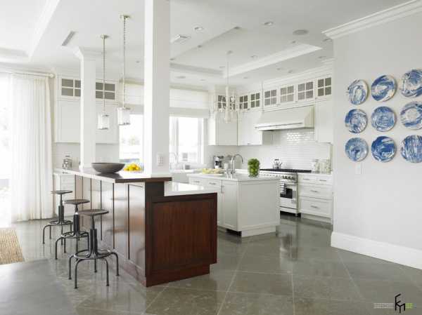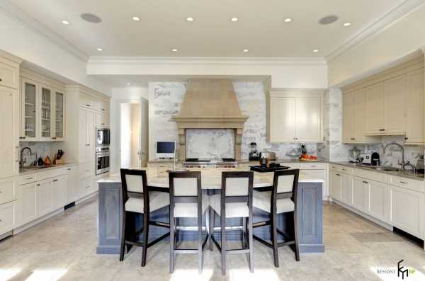 Проект такой кухни включает в себя больше элементов декора благодаря большей площади. К элементам декора можно смело отнести колонны и арки, камины и порталы, которые также можно использовать для зонирования.