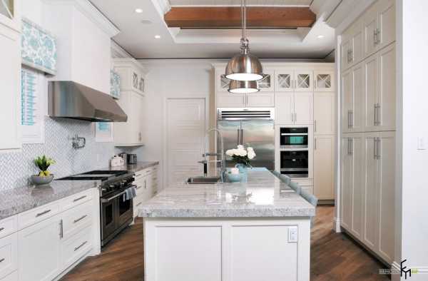 Бело-голубая цветовая гамма пришла в этот интерьер в стиле классика из греческого кантри и была успешно внедрена в современную обстановку. Использование древесины для исполнения столешниц рабочей зоны и кухонного острова немного «подогрело» прохладную палитру обстановки.