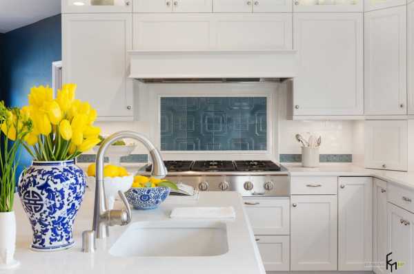 Кухонные шкафы в традиционном белоснежном исполнении лишь немного разбавлены яркой отделкой фартука, окраской прилегающей стены и расцветкой посуды, которая также является частью интерьера.