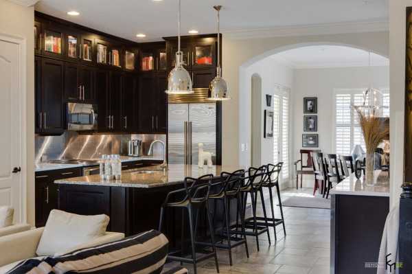 Можно сказать, что интерьер этой кухни-столовой с невероятно высокими потолками, выполнен в прогрессивно-классическом стиле. Традиционная обстановка засверкала новыми гранями за счет использования новейших материалов для отделки и изготовления предметов мебели и декора.