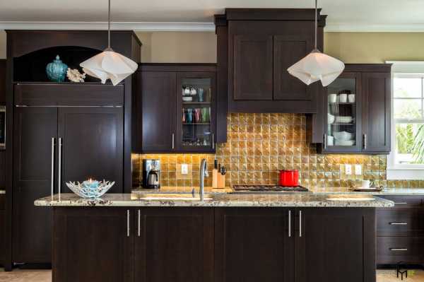 Но встречаются и дизайны классических кухонь, выполненные в темной, насыщенной цветовой гамме. Если размеры помещения позволяют, то использование темных пород дерева для кухонных шкафов станет намеком на роскошь и престиж в обустройстве пространства кухни. А интересные элементы декора с глянцевыми или блестящими поверхностями добавят комнате лоска и шарма.