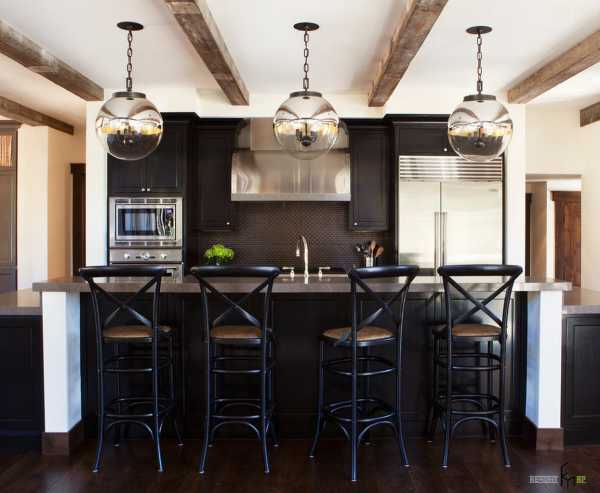 Дизайн этой кухни сложно назвать однозначно темным или светлым, он скорее контрастный, наполненный множеством интересных дизайнерских находок. Такое помещение хочется долго рассматривать и, безусловно, готовить и принимать пищу. Нетривиальный подход к изготовлению подвесных ламп и табуретов, яркое оформление кухонного фартука и использование открытых полок – все в этом интерьере работает на создание индивидуальности.