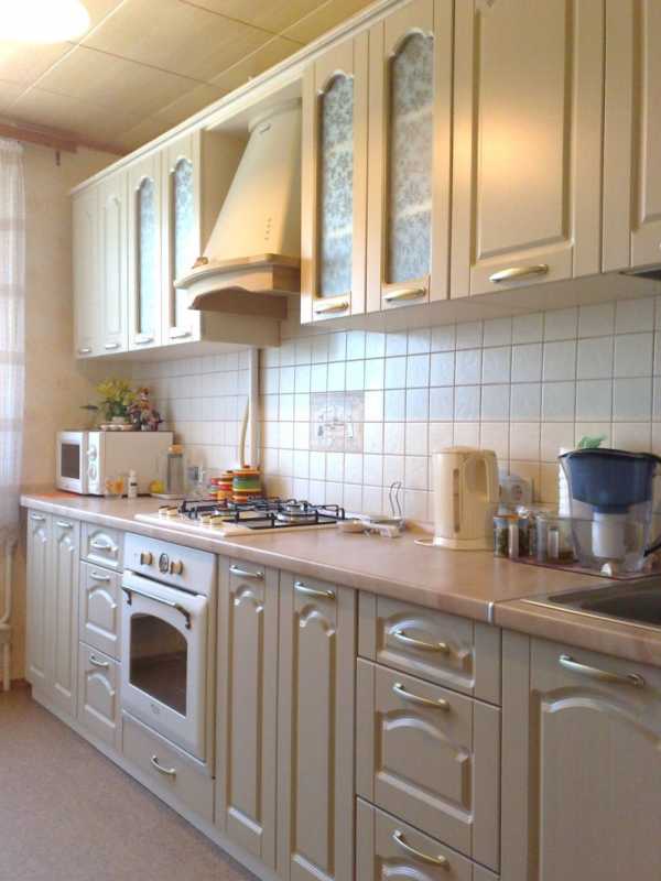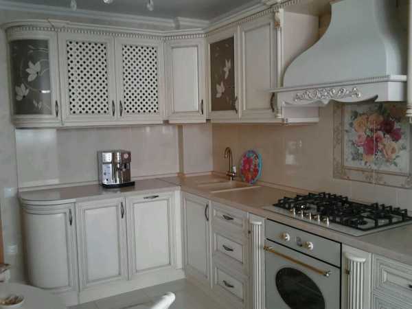 - Мебель с матовыми стеклами и резьбой, прекрасный вариант для кухни небольшого размера.
