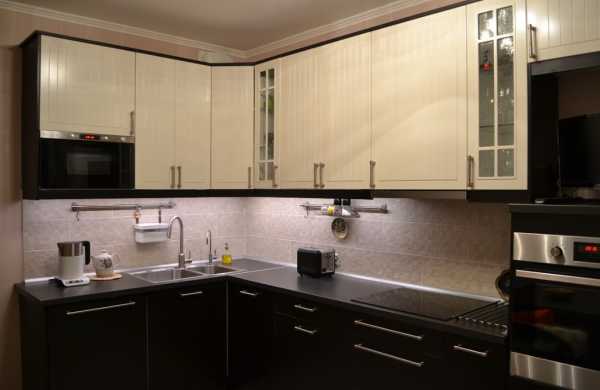 Преобладание черного в оформлении кухни допустимо только в просторных помещениях. Во всех остальных случаях чёрный разбавляется бежевыми оттенками, которые хорошо будут выглядеть в отделке пола, стен, столешницы и кухонного рабочего фартука.